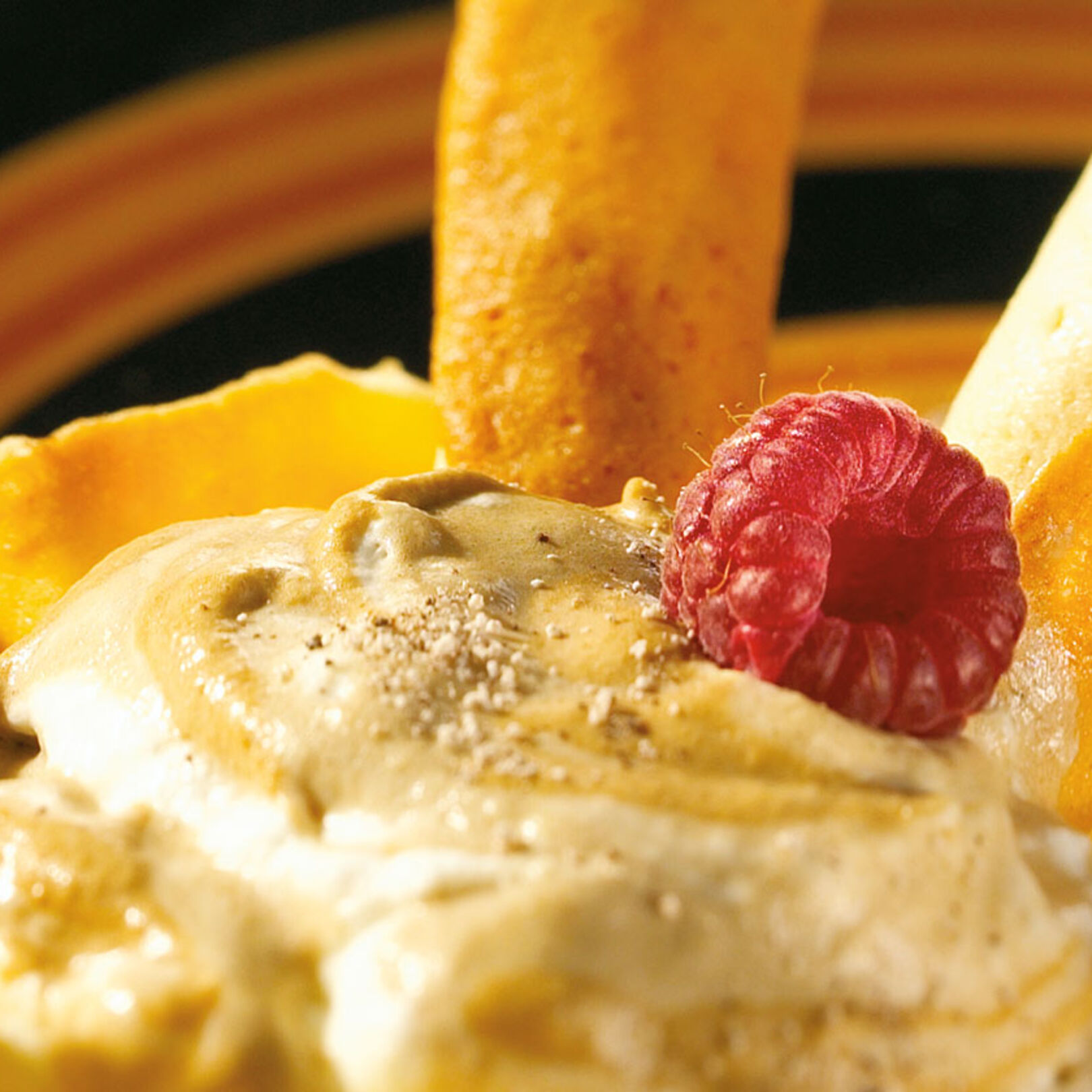 4. Für den Cappuccinoschaum: Eigelb, Ei und Zucker schaumig rühren, Cappuccinopulver zugeben, die Masse über dem heißen Wasserbad unter Rühren erwärmen, Marzipan Liqueur zugeben und so lange aufschlagen, bis sich das Volumen verdoppelt hat. Sahne steif schlagen und vorsichtig unterziehen. Cappuccinoschaum in Hippenschalen füllen, mit den Hippenröllchen und nach Wunsch mit frischen Himbeeren verziert servieren.