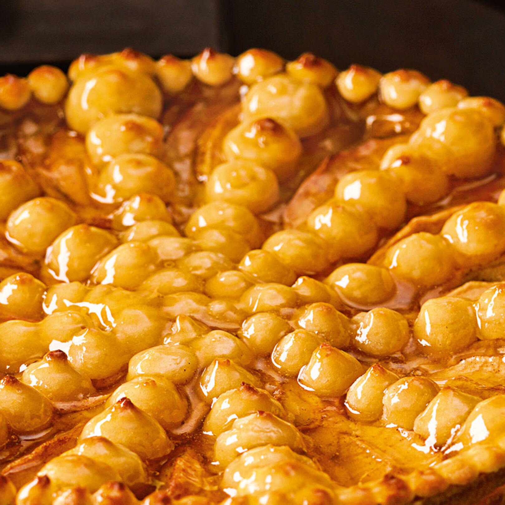 6. Aprikosenmarmelade mit Zucker und 3 EL Wasser in einen kleinen Topf geben. 2 Minuten aufkochen lassen, bis der Zucker gelöst ist. Die Aprikosenglasur auf die Tarte streichen.