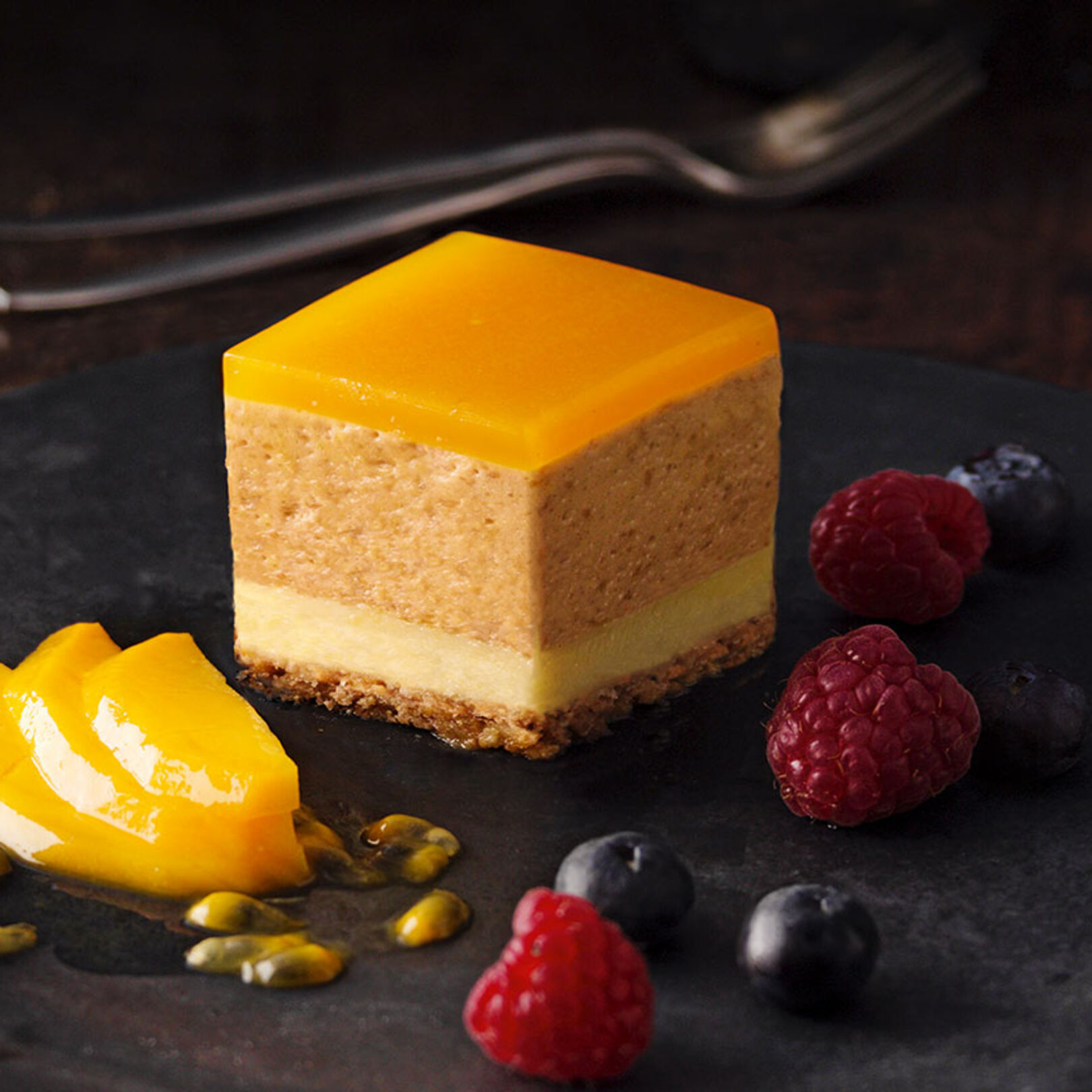 5. Wenn die Tarte ausreichend durchgekühlt ist, lösen Sie vorsichtig den Rahmen und schneiden Sie sie mit einem angewärmten Messer in Stücke in der gewünschten Größe. Auf Teller setzen und daneben jeweils einige Mangospalten drapieren. Die Passionsfrüchte halbieren und ein wenig vom Fruchtmark mit Kernen neben die Mang setzen. Zum Schluss ein paar Beeren dazu dekorieren.
