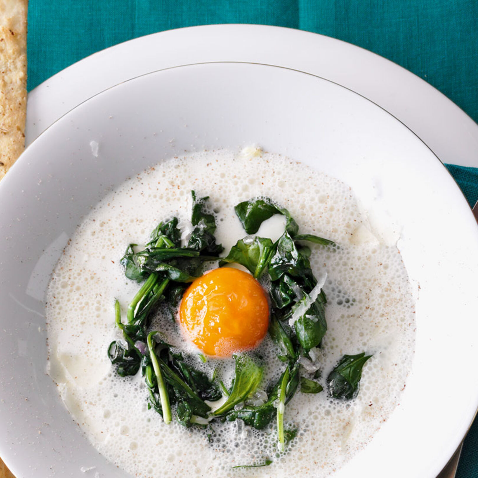 Den Spinat kreisförmig in 4 tiefen Tellern anrichten. Jeweils ein Eigelb vorsichtig aus der Butter nehmen und mittig in den Kreis setzen. Die Suppe erhitzen, mit der geschlagenen Sahne aufschäumen und in die Teller füllen. Die Marzipangrissini dazu servieren.
