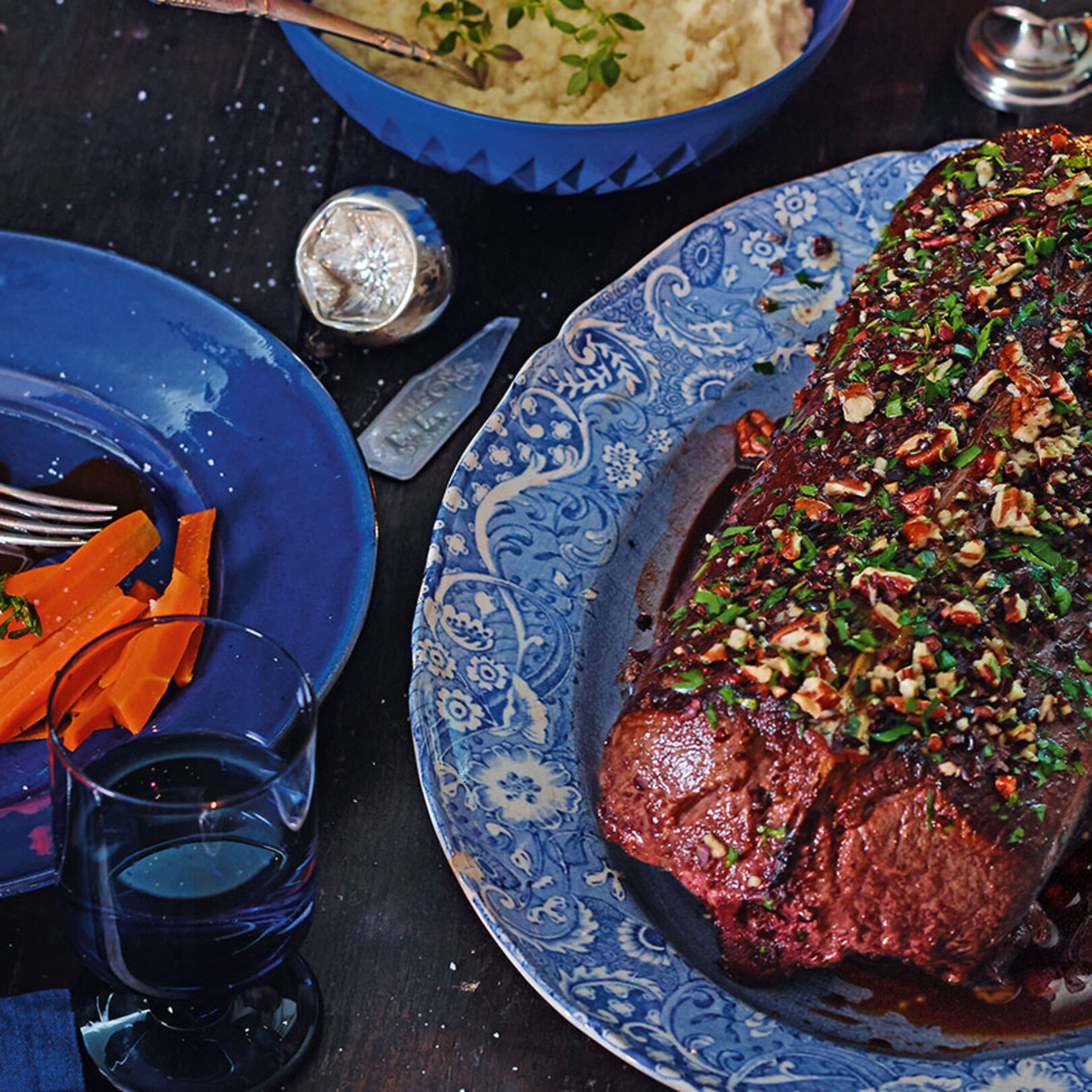 2. Für das Fleisch den Backofen auf 120 Grad Ober-/Unterhitze vorheizen. Falls nötig das Fleisch mit einem scharfen Messer vom Knochen lösen. Fleisch ringsherum leicht salzen und in einer ofenfesten Pfanne im heißen Olivenöl mit einigen Thymianzweigen darin rundherum anbraten. Fleisch pfeffern, Butter zufügen, die Pfanne auf mittlerer Schiene auf einem Rost in den Backofen schieben und das Fleisch etwa 20 Minuten fertig garen. Die Nüsse in einer Pfanne ohne Fett anrösten, herausnehmen, etwas abkühlen lassen und hacken. Die Petersilienblätter und die restlichen Thymianblättchen abzupfen und fein schneiden. Kräuter und Kakaobohnensplitter mit den Nüssen mischen und auf einen großen flachen Teller geben.