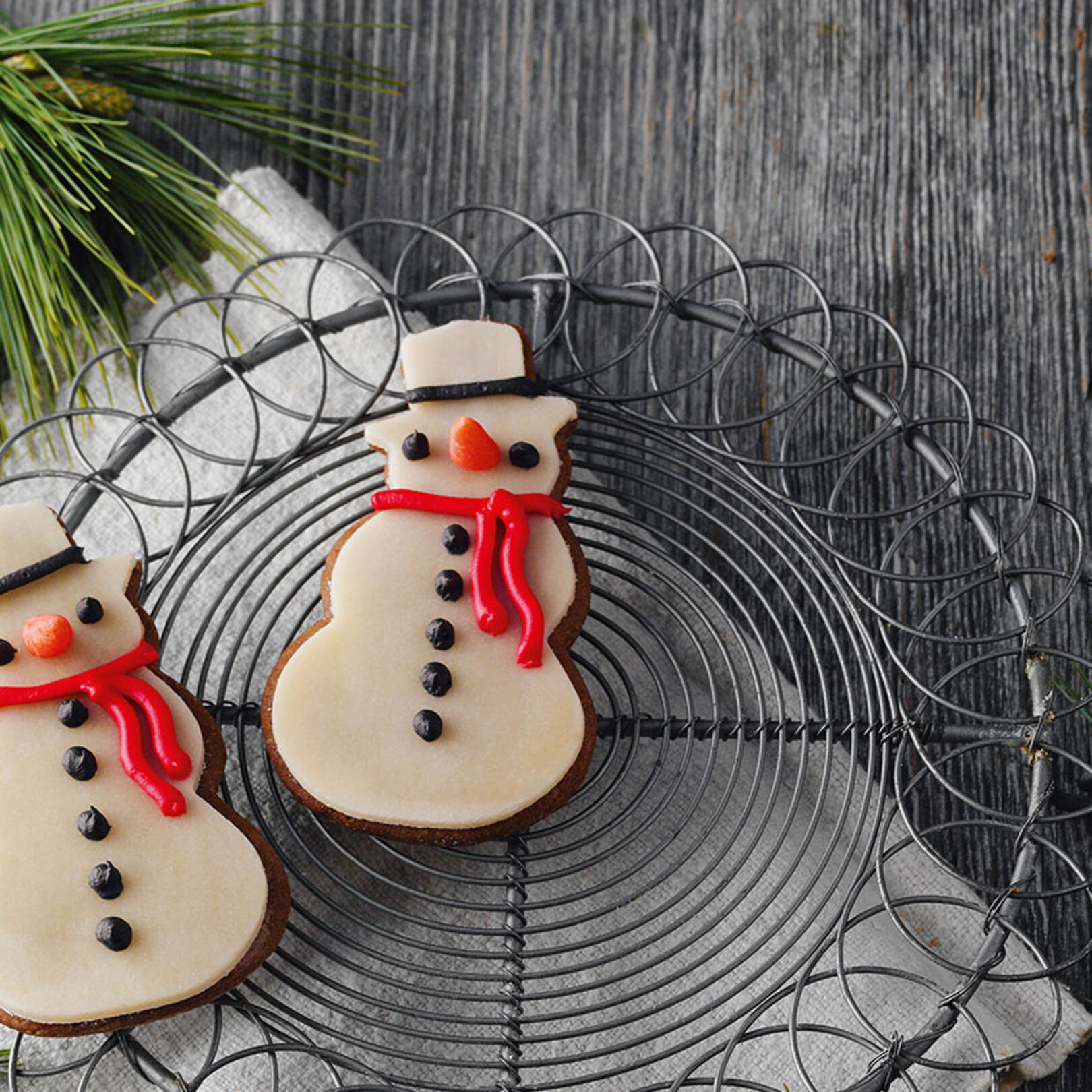 2. Backofen auf 180 °C Ober-/Unterhitze (Umluft: 160 °C) vorheizen. Zwei Backbleche mit Backpapier belegen. Den Teig und die Arbeitsfläche mit Mehl bestreuen, den Teig darauf ca. 3 mm dick ausrollen. Schneemänner (10 cm hoch) ausstechen und auf die Bleche legen.