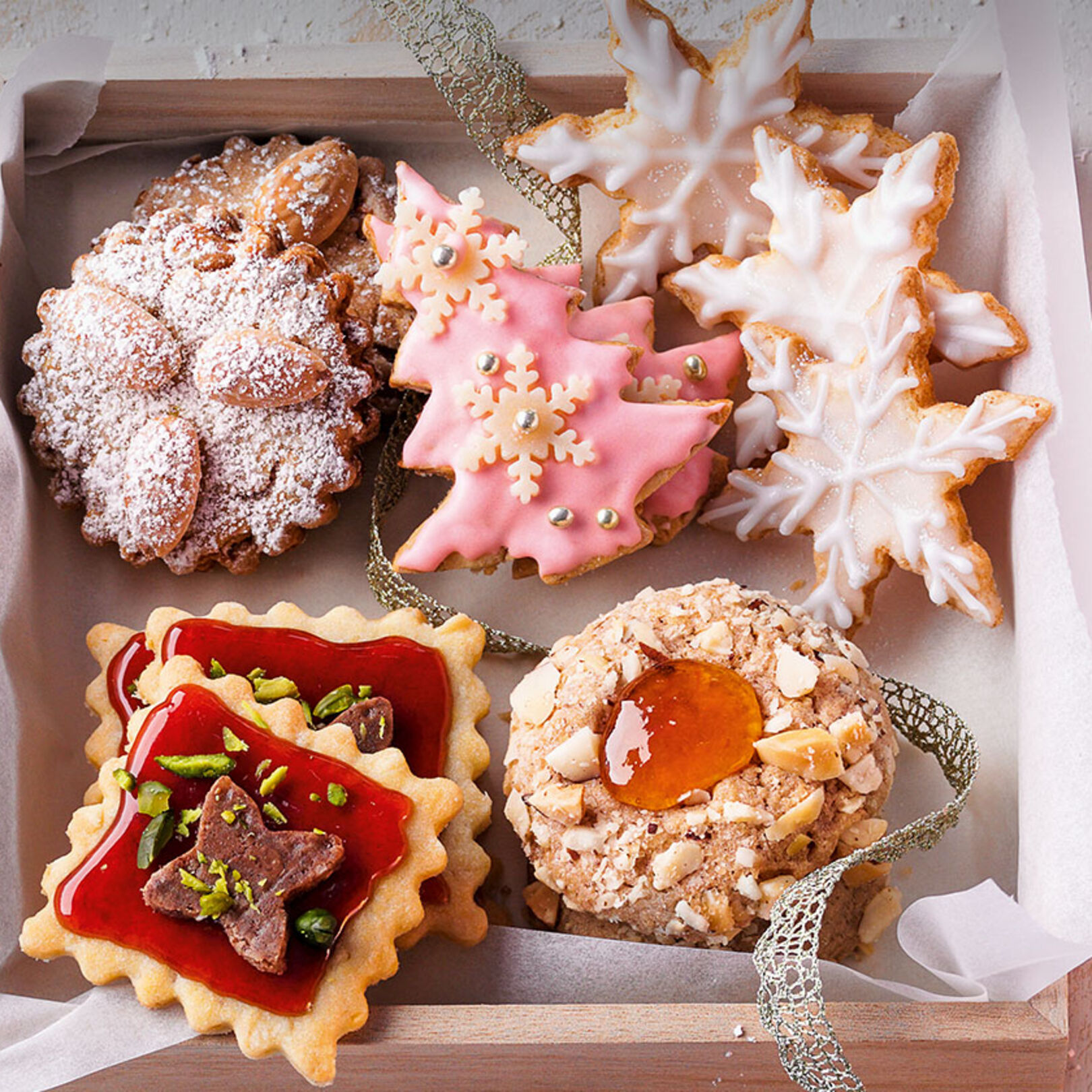 6. Die Kekse abkühlen und mit Puderzucker bestreuen. Zum Aufbewahren die Kekse unbestreut in eine luftdicht verschlossene Dose lagern. Sie halten 3-4 Wochen. Zum Servieren dann frisch mit Puderzucker bestreuen.