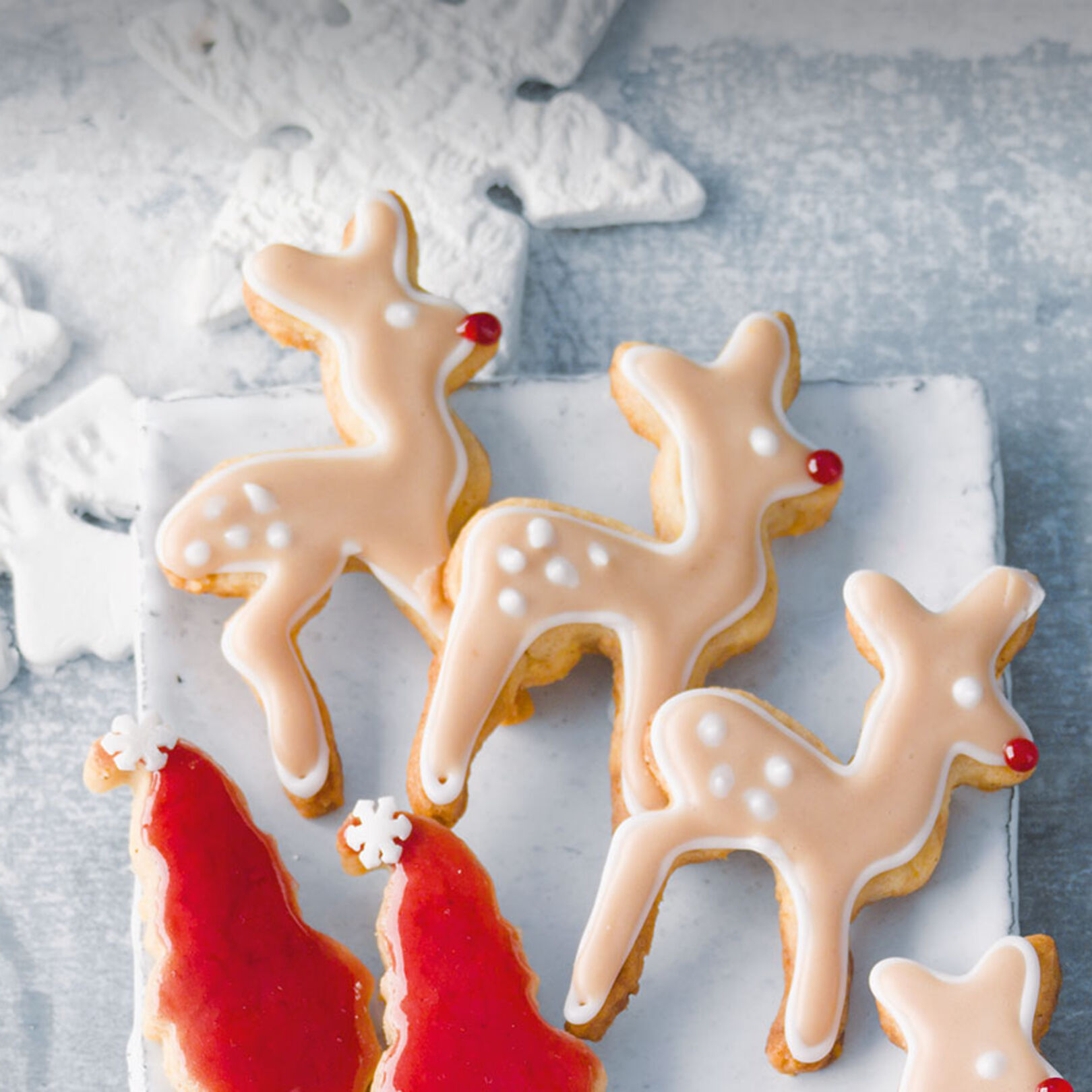 3. Den Teig geschmeidig kneten und mit Mehl bestreuen. Auf der Arbeitsfläche 4 mm dick ausrollen. Eine Reh-Ausstechform (7,5 cm hoch) in Mehl tauchen. Den Teig damit ausstechen, vorsichtig auf das Backblech legen. Die Bleche nacheinander in die mittlere Einschubleiste des Backofens schieben. Ca. 10 Minuten goldbraun backen.