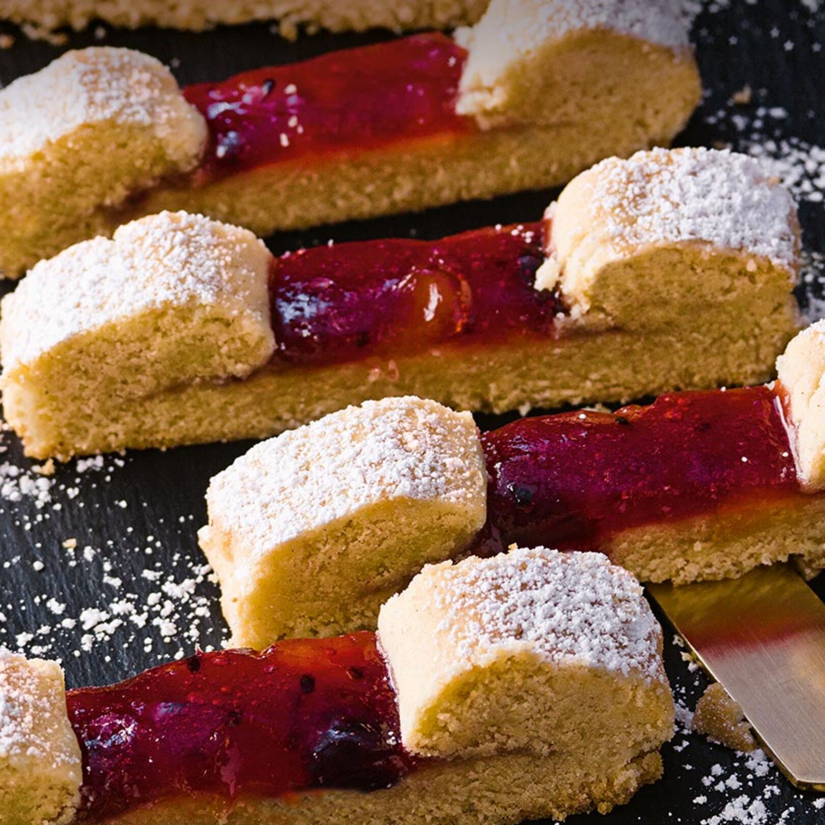 3. Marmelade glatt rühren. Mittig auf die ausgerollten Teige geben und ca. 8 cm breit ausstreichen. Die Teigseiten zur Mitte hin einschlagen. Ein Backpapier auf ein Backblech ziehen. Auf der mittleren Schiene ca. 14 Minuten hellbraun backen. Herausnehmen und den zweiten Cassis-Teig ebenso backen. Noch heiß in ca. 1,5 cm breite Streifen schneiden. Abkühlen lassen und mit Puderzucker bestreut servieren.