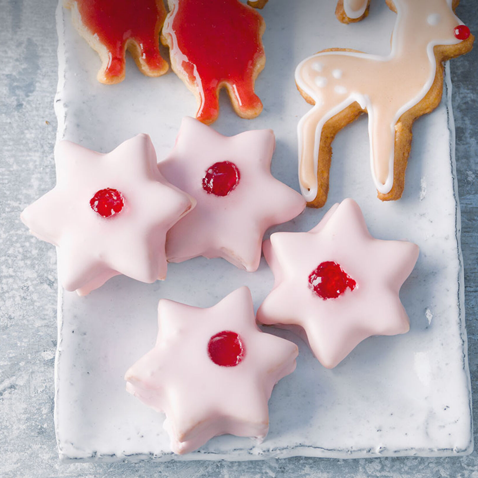 5. 250 g Puderzucker, Kirschwasser und Zitronensaft in eine Rührschüssel füllen und zu einer weich fließenden Glasur verrühren. Kekssterne in die Glasur tauchen und auf einem Gitterrost abtropfen lassen. Einen Tropfen Konfitüre auf die feuchte Glasur tupfen. Nach dem Trocknen luftdicht verschlossen aufbewahren. Die Marzipan-Himbeer-Sterne halten 3 bis 4 Wochen.