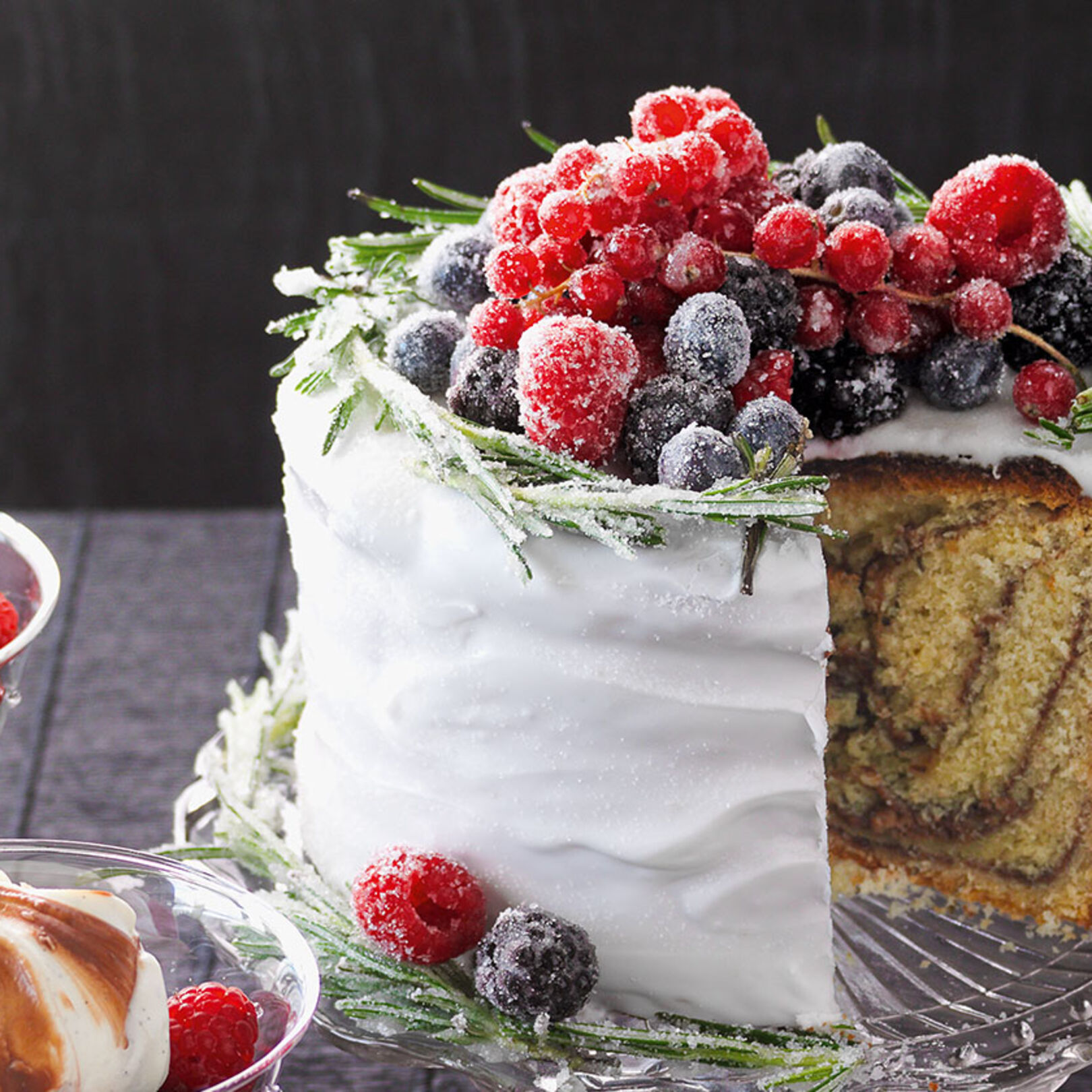 10. Rosmarinzweige auf den Kuchen und an den Rand legen. Vor dem Servieren die Beeren verlesen, waschen und abtropfen lassen. In eine Schüssel geben. Mit 1 El Marzipanlikör beträufeln und in der Schüssel schwenken bis sie leicht benetzt sind. Mit 20 g Kristallzucker bestreuen und in der Schüssel schwenken, bis sie gleichmäßig mit Zucker überzogen sind. Auf die Briochetorte legen und servieren.