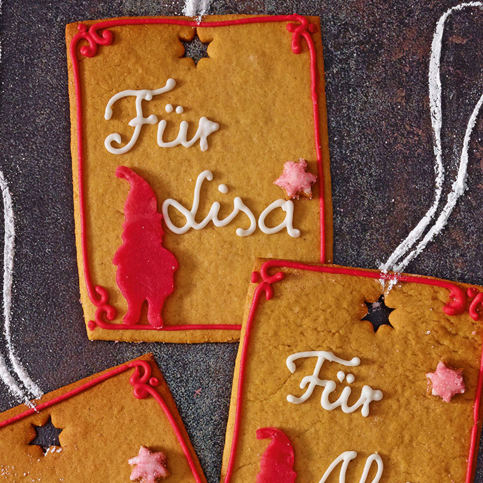7. Sterne mit roter Glasur bespritzen und mit rotem Zucker bestreuen. Mit Glasur auf die Karte kleben. Backmarzipan mit 1 TL Rote-Beete-Saft verkneten. Mit dem übrigen Puderzucker bestreuen und zwischen zwei Gefrierbeuteln dünn ausrollen. Mit Zwerg-Ausstechformen ausstechen. Einen Klecks Zuckerglasur auf die Lebkuchenkarten geben und die Zwerge darauf kleben.