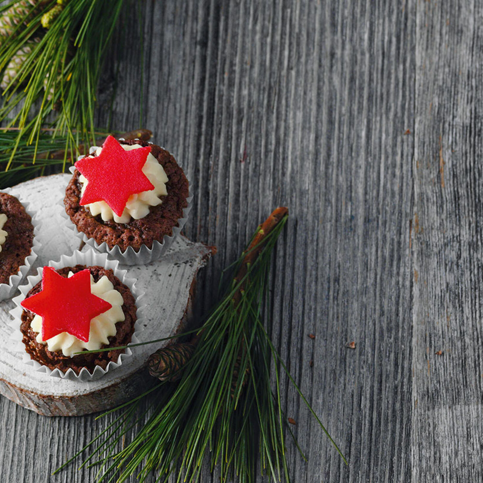 5. Marzipanbrot zerkleinern und mit der Speisefarbe verkneten. Mit Puderzucker bestreuen und ca. 2 mm dick ausrollen. Mit einem Sternausstecher (0,5 cm) kleine Sterne ausstechen und diese auf die Nougatmuffins legen.