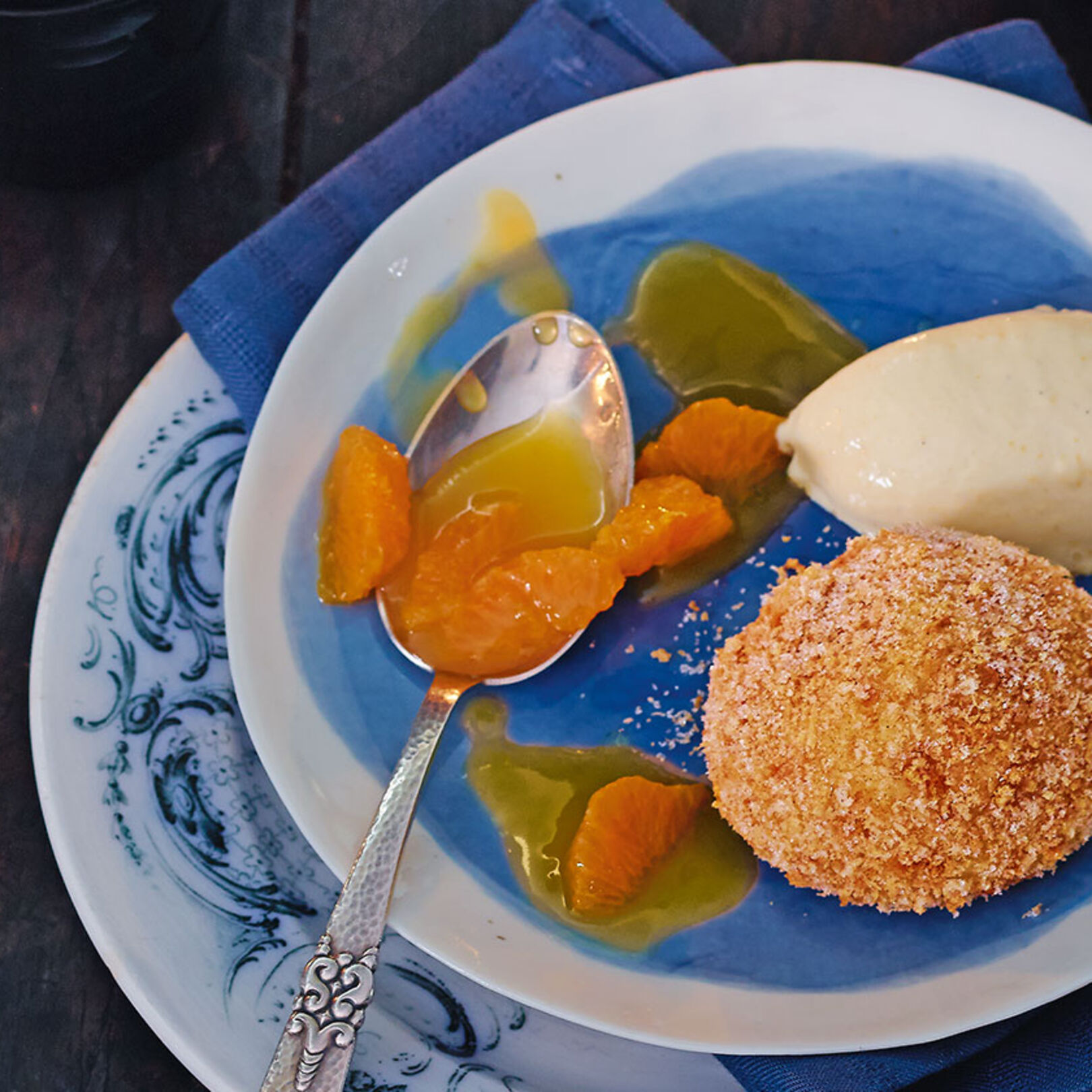 2. Den Zucker karamellisieren lassen und mit dem Grand-Marnier-Likör und dem Orangensaft ablöschen. Die Vanilleschote, das Mark und die Gewürze dazugeben. Alles um die Hälfte reduzieren und ca. 1 Stunde ziehen lassen. Die Speisestärke mit kaltem Wasser anrühren und den Gewürzorangensaft leicht abbinden. Alles durch ein feines Sieb passieren und die Clementinenfilets dazugeben.