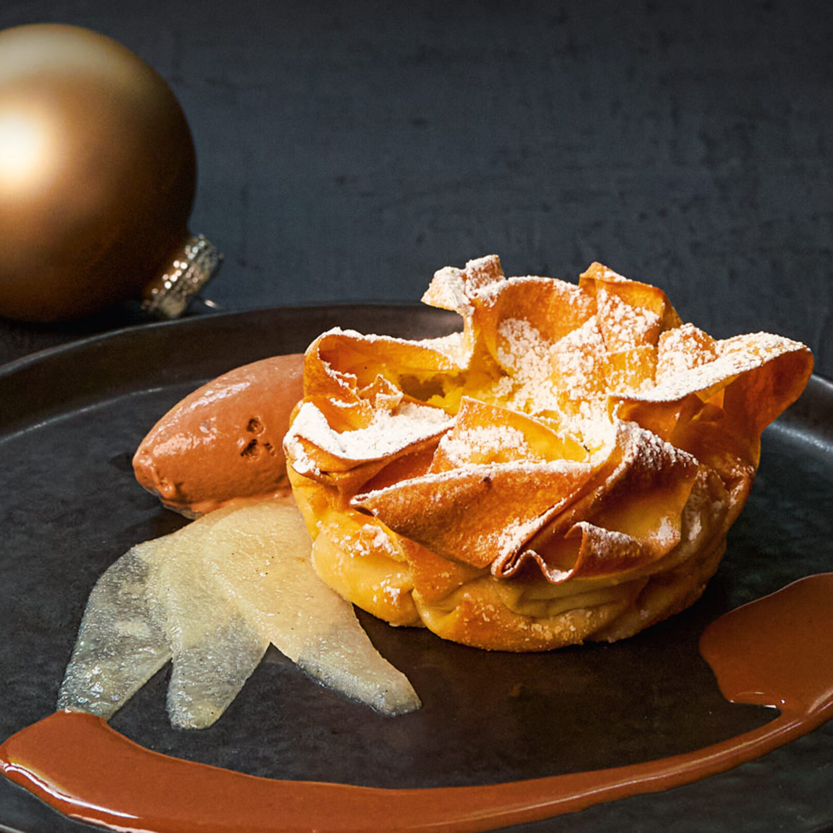 Marzipan im Knusperblatt mit pochierter Williamsbirne und Nougatsauce