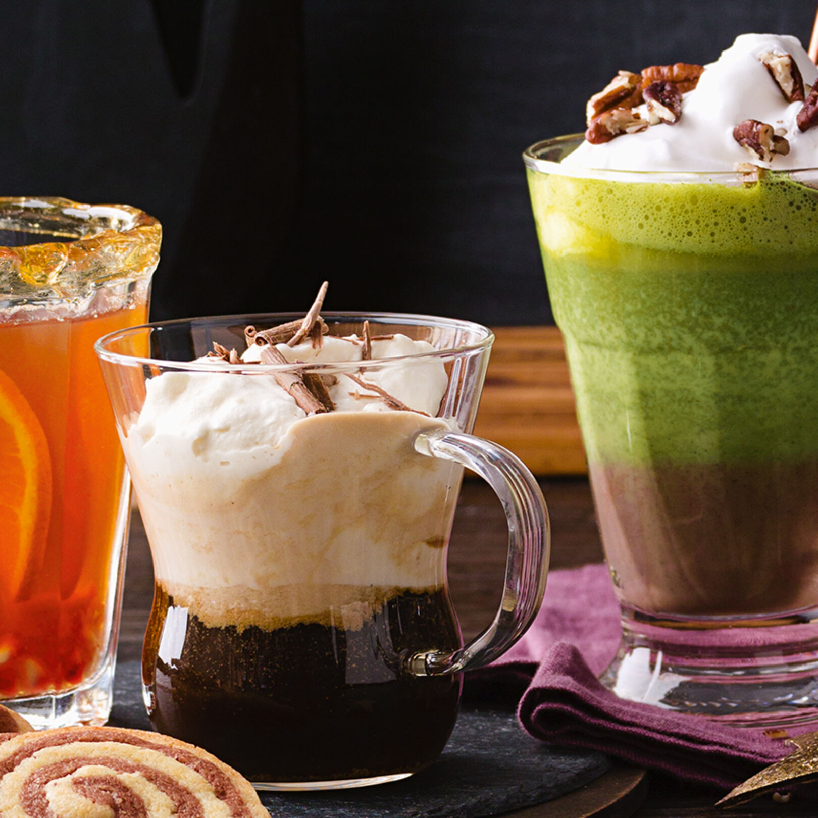 3. Von der Orange 2 Scheiben abschneiden. Die übrige Frucht auspressen und zum Punsch gießen (Teebeutel und Gewürze entfernen). Ahornsirup und Marzipan-Liqueur darin verrühren. Orangenscheiben und Granatapfelkerne in 2 Gläser geben. Den Punsch hineingießen, sofort servieren.